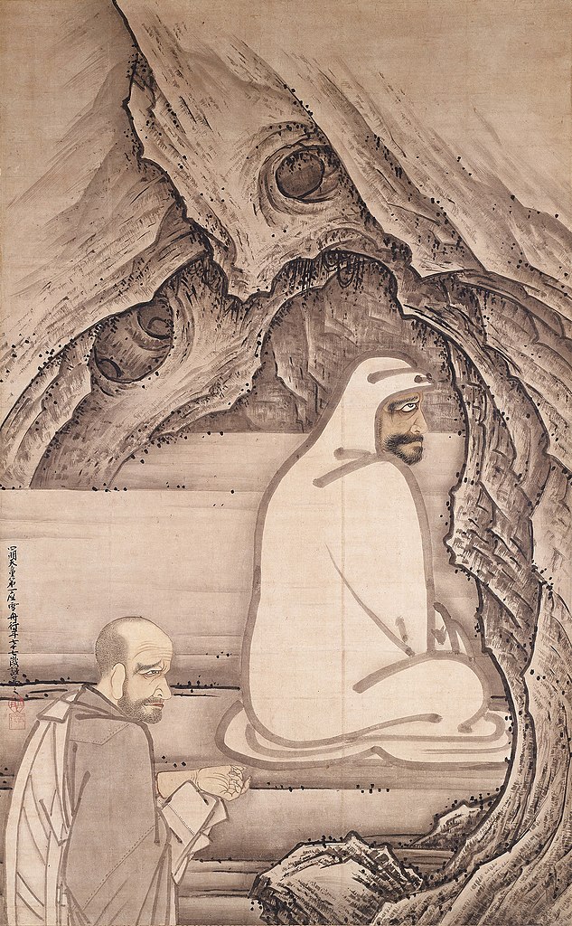 Tradition has it that Zen/Chan was founded by Bodhidharma, “who was born in South India sometime in the 5th or 6th century. He traveled to China and meditated facing a rock wall for nine years. His disciples were said to be Huike (Jp Eno), Sengcan (Jp Sosan), Daoxin (Jp Doshin), Hongren (Jp Konin) and Huineng (Jp Eno – 6th Patriarch). However,” Nishihira notes, “things are not that simple. In the first place, some qualifications are necessary before one can say that ‘Zen started with Bodhidharma’.”